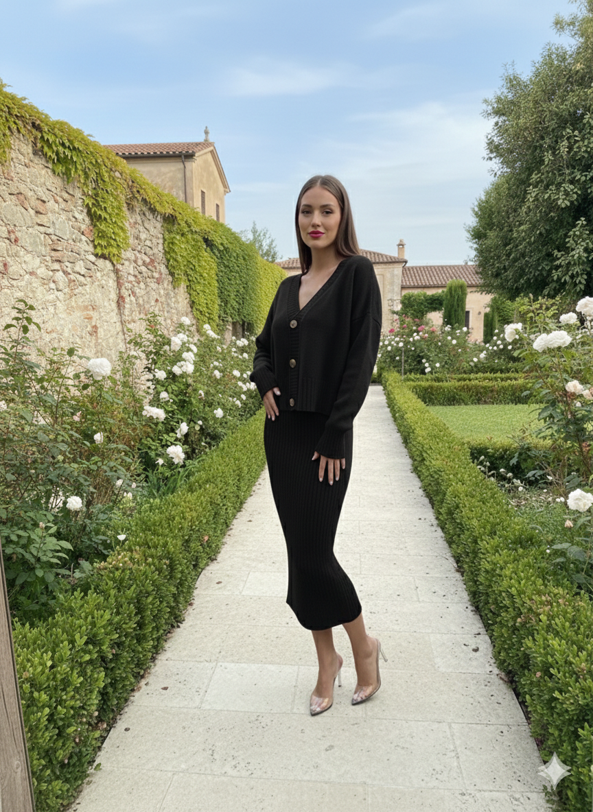 Black Buttoned Cardigan Skirt Set